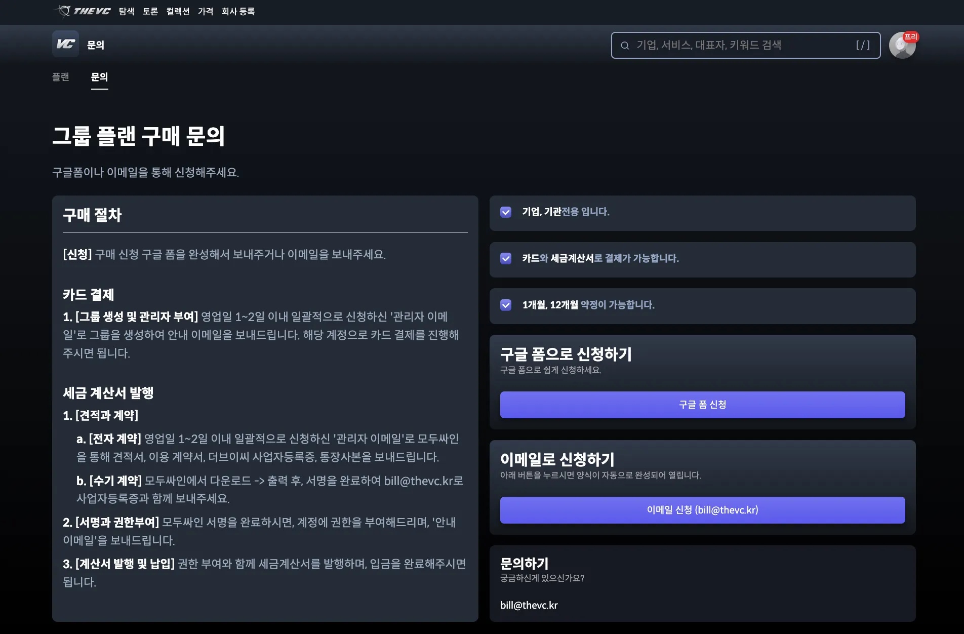 ‘그룹’ 선택 후 플랜을 설정해 문의하기 버튼을 클릭합니다. 체크박스를 확인한 후 구글 폼 신청 버튼을 클릭합니다.