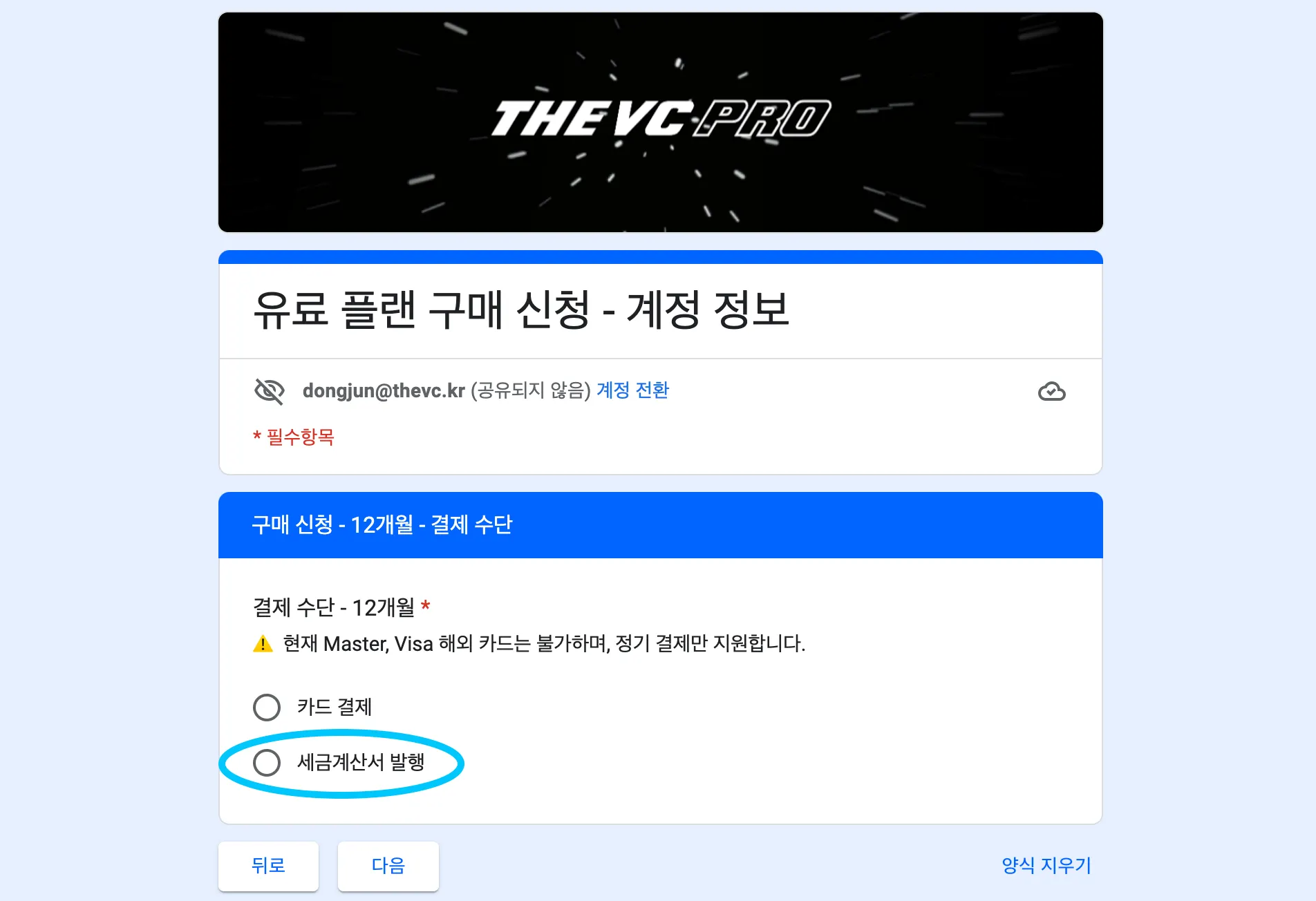 구글 폼에 원하는 내용을 기입하는 과정 중, 결제 수단을 ‘세금계산서 발행’으로 선택하여 신청