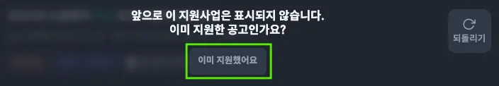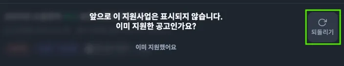 되돌리기: 관심없음 또는 이미 지원했어요 버튼을 누른 후, ‘되돌리기’ 버튼을 누르면 설정이 취소되어 ‘관심없는 지원사업’ 및 ‘이미 지원한 지원사업’ 목록에서 지원사업이 삭제됨