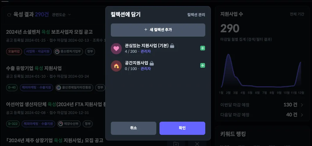 컬렉션을 눌러 각 컬렉션에 포함된 지원사업의 목록을 확인하고, 목록에 포함된 지원사업의 공고를 눌러 해당 지원사업의 상세 페이지로 이동할 수 있습니다.