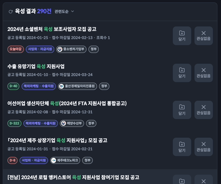 설정한 검색어 및 필터에 대한 지원사업 탐색 결과를 제공합니다.