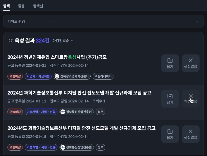 관심없는 지원사업: 관심없음으로 설정된 지원사업은 ‘활동’ 탭의 ‘관심없는 지원사업’ 목록에서 확인 가능