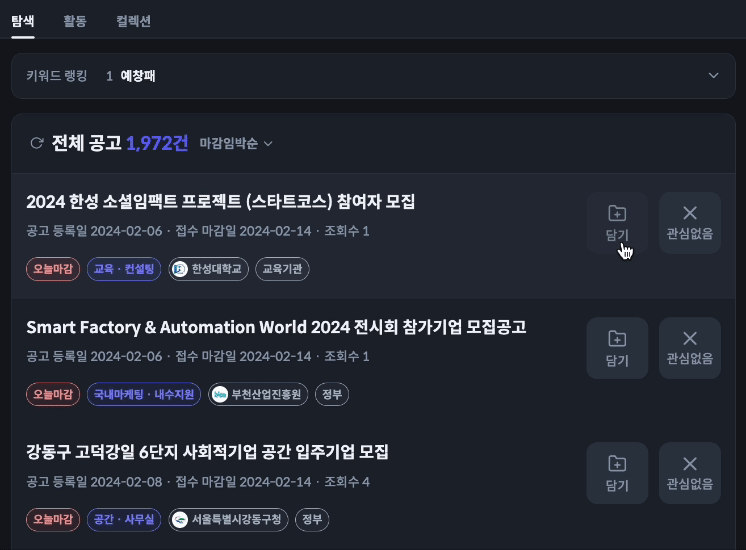 지원사업 공고 제목 우측의 ‘담기’ 버튼을 눌러 지원사업을 컬렉션에 담을 수 있습니다.