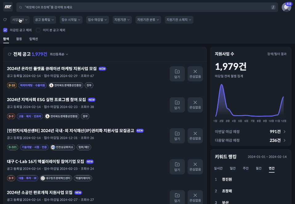 탐색 조건에 부합하는 지원사업의 수와 마감일 기준 월별 분포를 그래프로 확인하고,이번달/다음달 마감 예정인 공고를 분류해 좌측 탐색창에서 확인할 수 있습니다.
