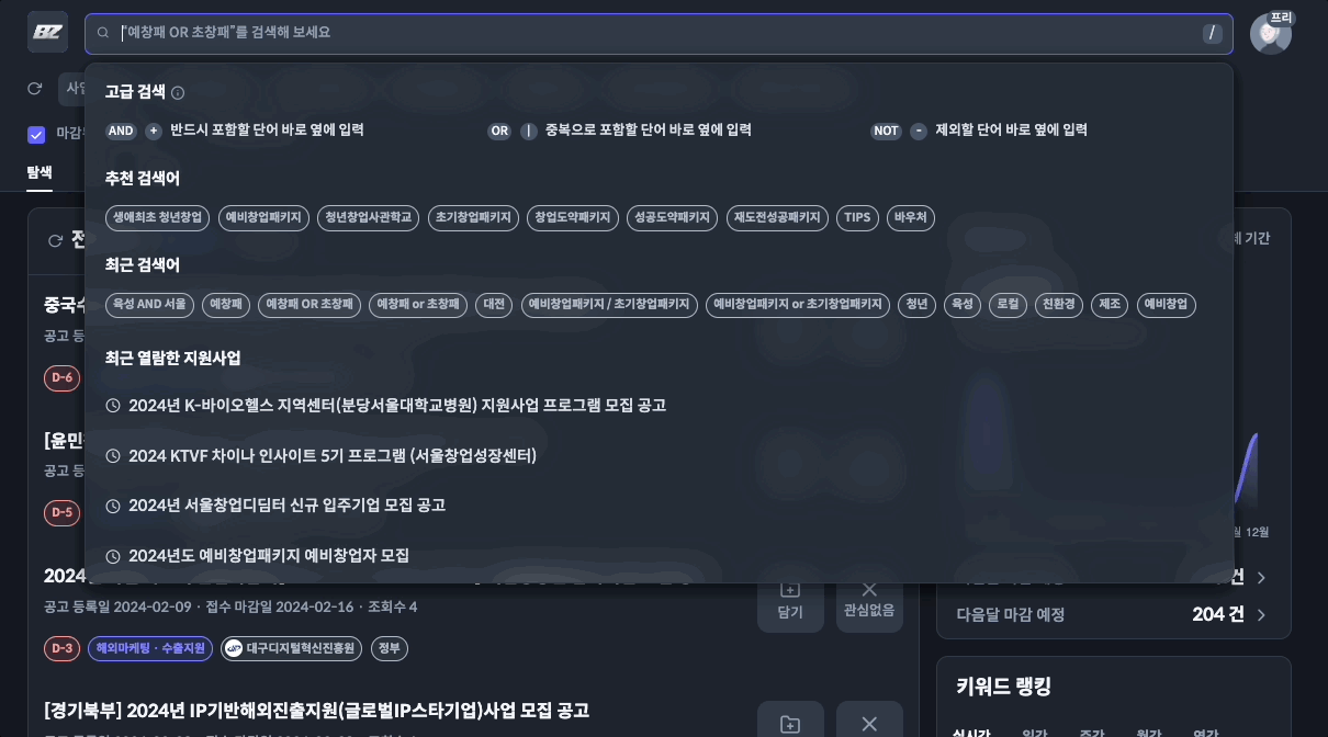 사용자들이 지원사업 검색창에서 많이 검색한 키워드의 랭킹을 제공합니다.